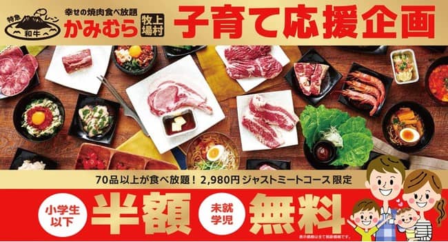 名物カタマリ肉「プレミア4」を含めた2,980円(税抜)の「ジャストミートコース(70品)」限定で小学生以下は半額、幼児は無料になるキャンペーンを実施いたします。もちろん新鮮野菜がたっぷり食べられるサラダバーの他にアイスバーも食べ放題、是非この機会にかみむら牧場をご家族でご利用してください!