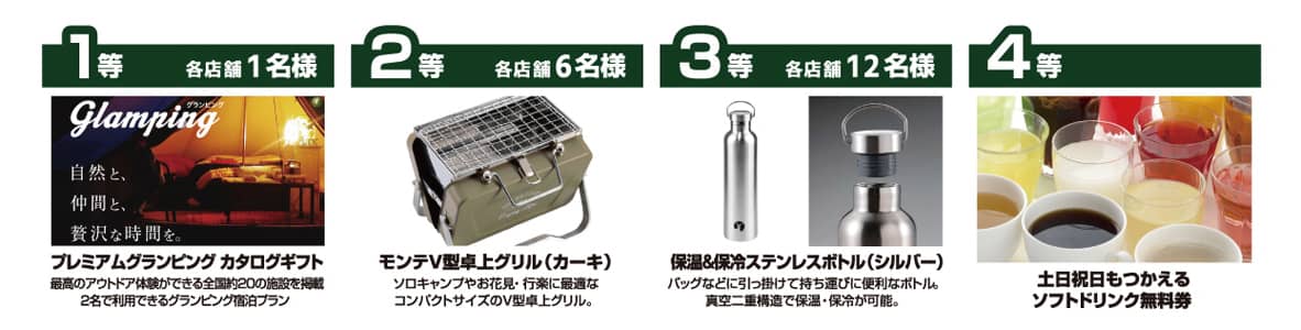 <1等>賞品:「プレミアムグランピング カタログギフト」(各店舗1名様) 定価:55,000円(税込) 内容:最高のアウトドア体験ができる全国約20の施設を掲載。 手ぶらで楽しめる快適グランピング宿泊プラン