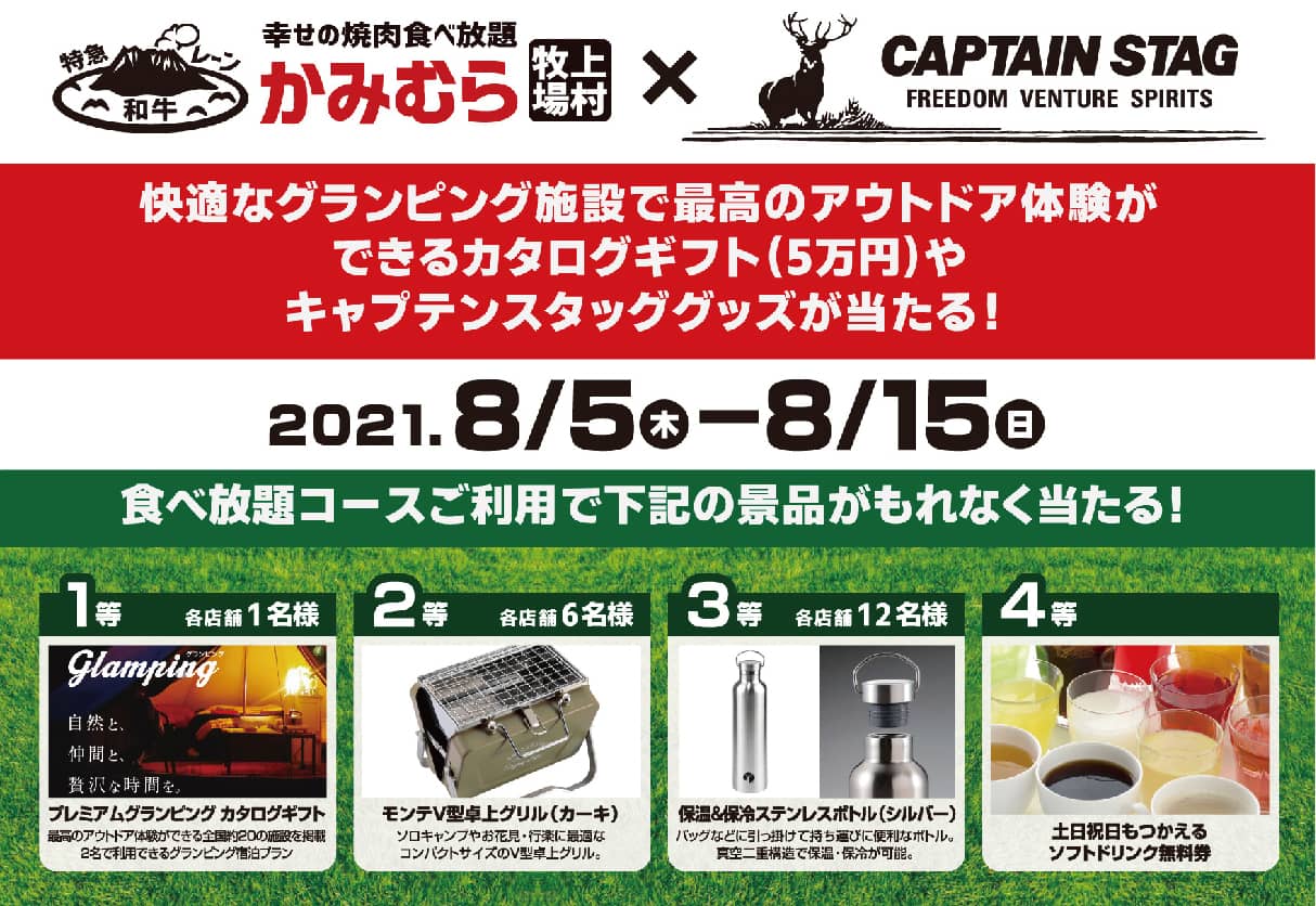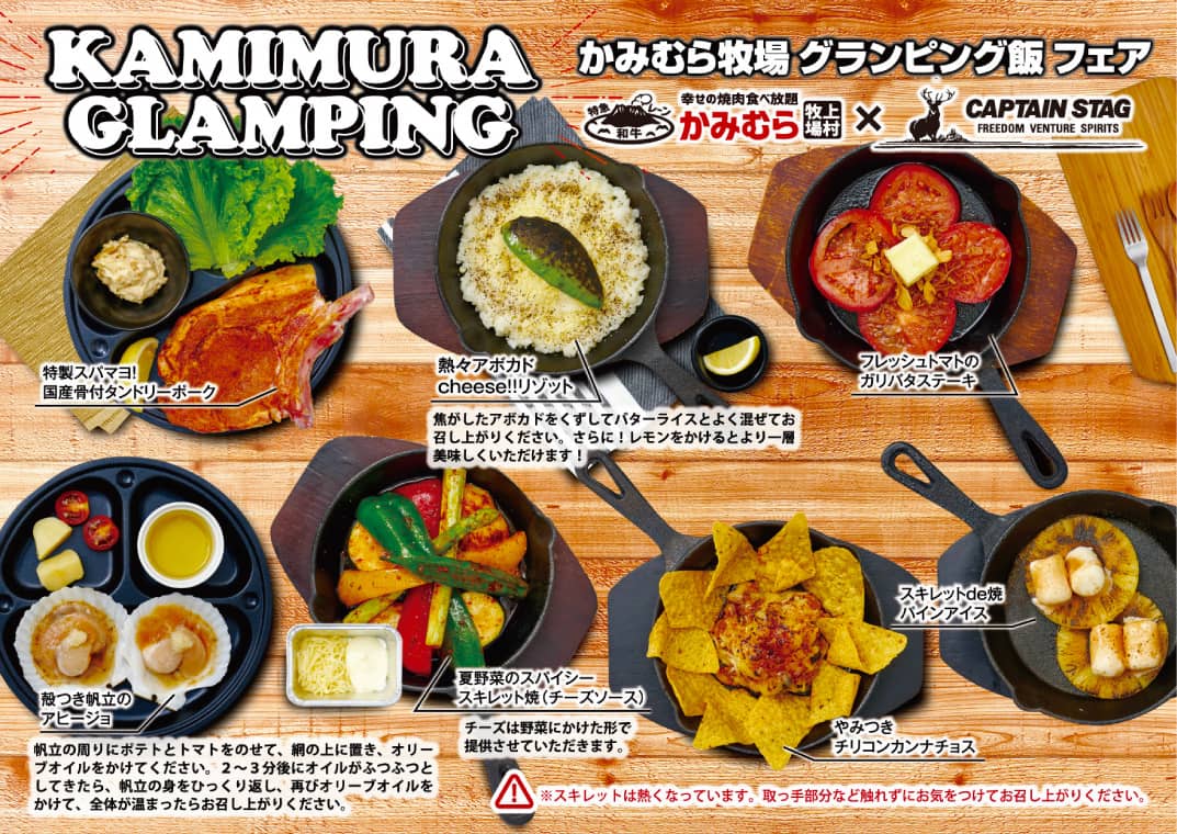 「グランピング飯フェア」では、『かみむら牧場』の食べ放題コースの通常メニューに加え、グランピングで真似したくなるような「殻付きホタテのアヒージョ」や「やみつきチリコンカンナチョス」など7種類、お子様からご年配の方まで幅広い年代に楽しんでいただけるお料理をご用意いたしました。さらに、食べ放題コースをご利用いただいたお客様には、快適なグランピング施設で最高の体験ができる『グランピング施設宿泊券』やアウトドアメーカー『キャプテンスタッグ』の手軽にバーベキューが楽しめる『バーベキューコンロ』、持ち運びに便利な『ステンレスボトル』、『土日祝日もつかえるソフトドリンク無料券』のいずれかが、抽選でもれなくもらえる「夏休み満喫アイテムゲットだぜ!キャンペーン」を開催しています。