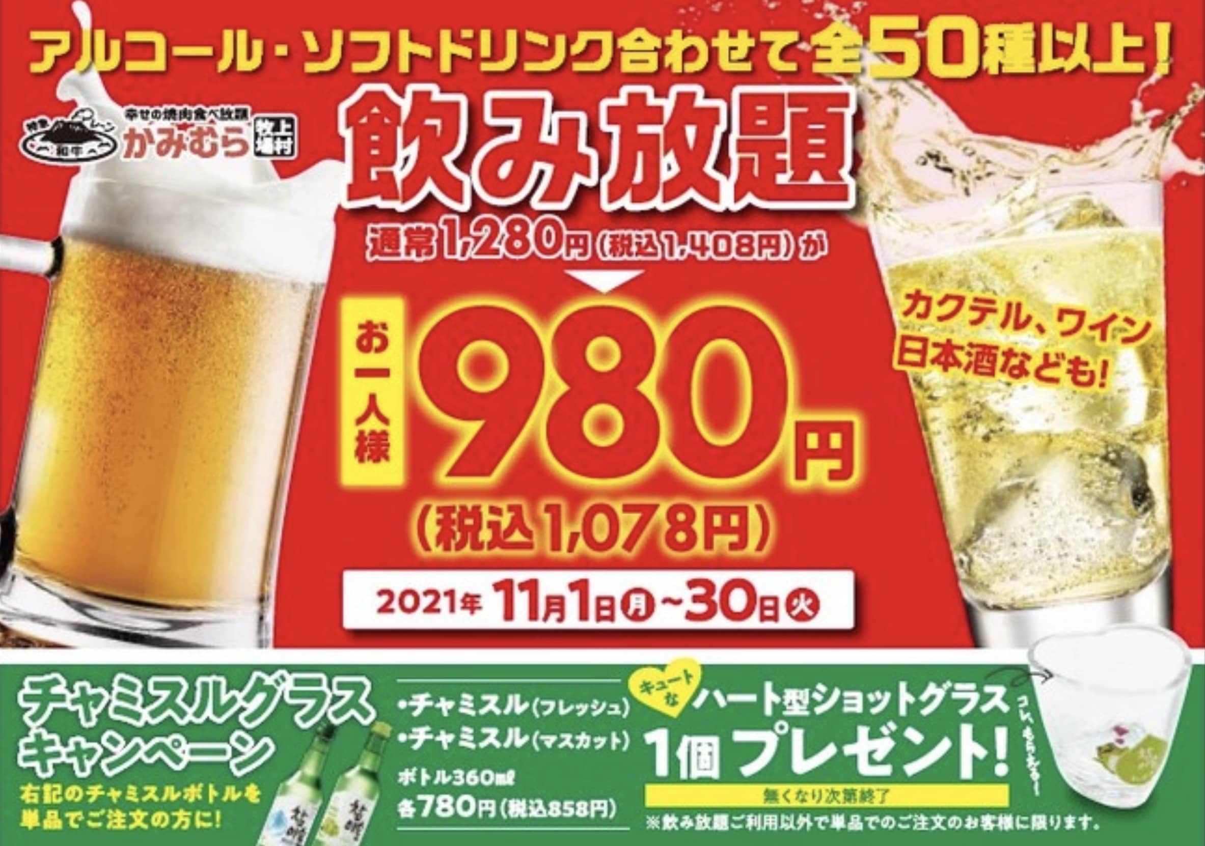 緊急事態宣言下、外食を控えていらっしゃったお客様、ノンアルコールで我慢して下さったお客様、お待たせしました!かみむら牧場から大好評企画『和牛マニアコースご利用でレモンサワー飲み放題』に続く第二弾として!2021年11月1日(月)~11月30日(火)の1か月間、ランチのご利用でも!食べ放題のご利用でもアルコール·ソフトドリンク合わせて全50種類以上が980円(税込1,078円)で飲み放題になるキャンペーンを開催いたします。
