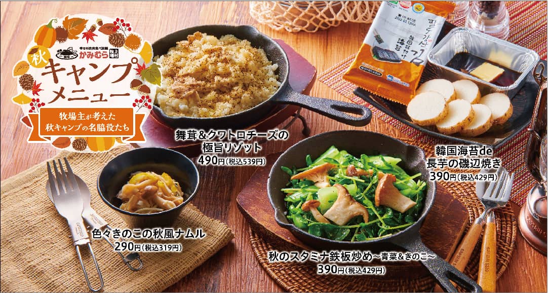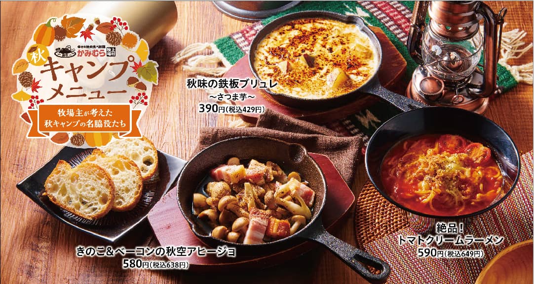 A4以上の*薩摩牛(黒毛和牛)を中心とした絶品焼肉と専門店にも負けない本格派の逸品料理が自慢の『かみむら牧場』が秋の期間限定メニューとして2021年9月28日(火)から、ちょとおしゃれなキャンプメニュー『秋キャンプ ~牧場主が考えた秋キャンプの脇役達~フェア』を開催します。