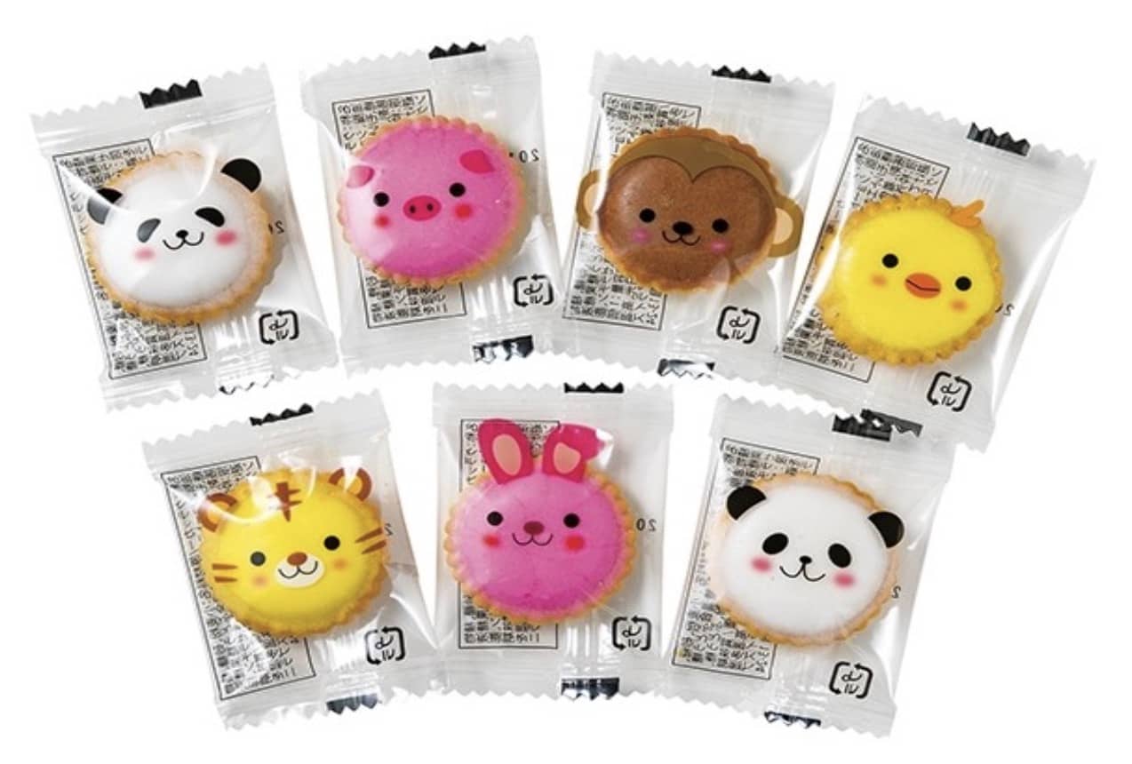 カラフルな砂糖でコーティングされたクラッカーを動物の顔がプリントされた透明袋で個装しています。