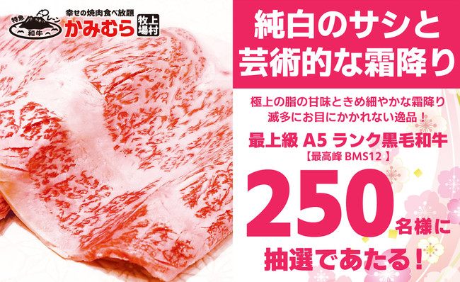 グランドメニューのリニューアルを記念して、この春だけの「A5ランク黒毛和牛(※) 250名様に抽選であたる!キャンペーン」を開催!! 極上の脂の甘味ときめ細やかな霜降り肉の柔らかさは一見の価値あり。4月3日(土)~4月11日(日)の期間内「かみむら牧場」3店舗にて合計250名様に抽選でプレゼント! 是非この機会に、滅多にお目にかかれない逸品をお召し上がりください。