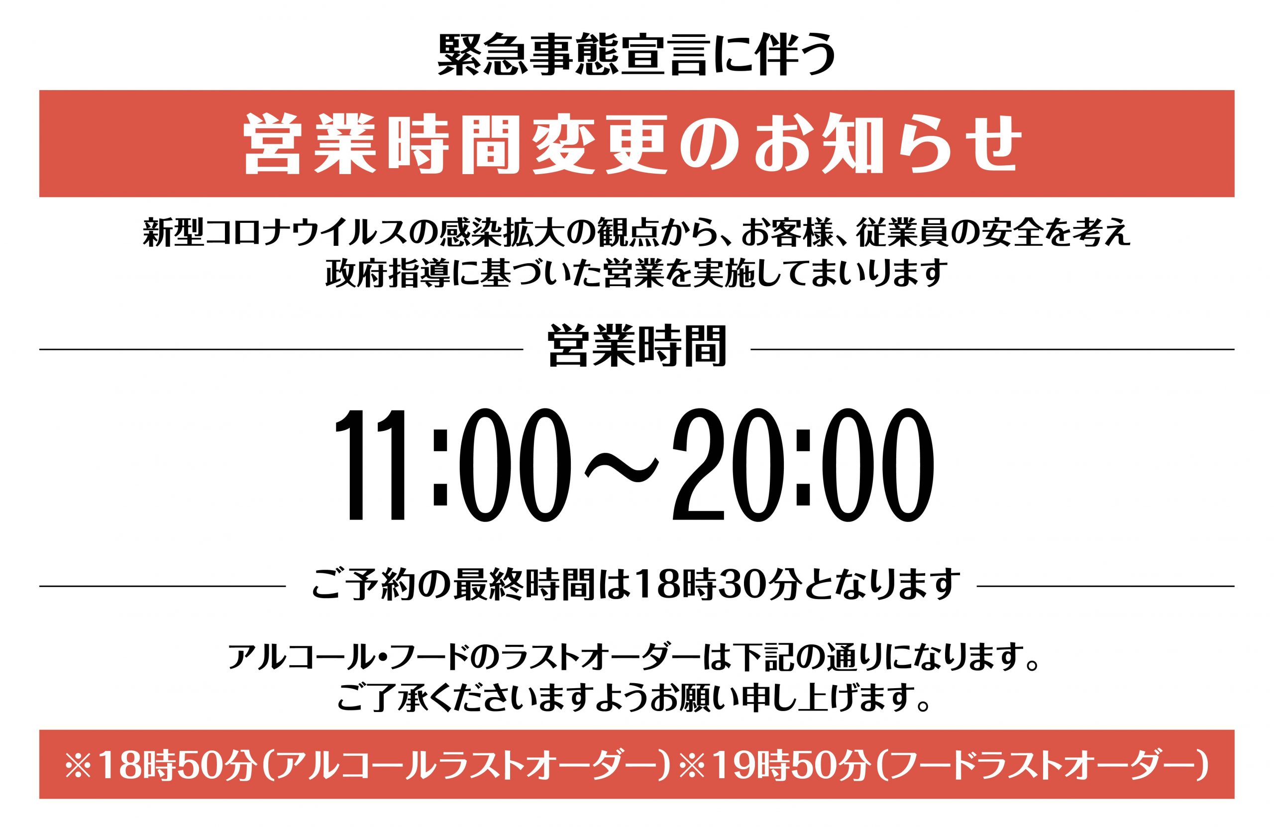 2021.01.12 緊急事態宣言に伴う営業時間変更のお知らせ 新型コロナウイルスの感染拡大の観点から、お客様、従業員の安全を考え政府指導に基づいた営業を実施してまいります。 営業時間 11:00〜20:00 ※19時30分(最終入店) アルコール・フードのラストオーダーは下記の通りになります。 ご了承くださいますようお願い申し上げます。 ※18時50分(アルコールラストオーダー) ※19時50分(フードラストオーダー)