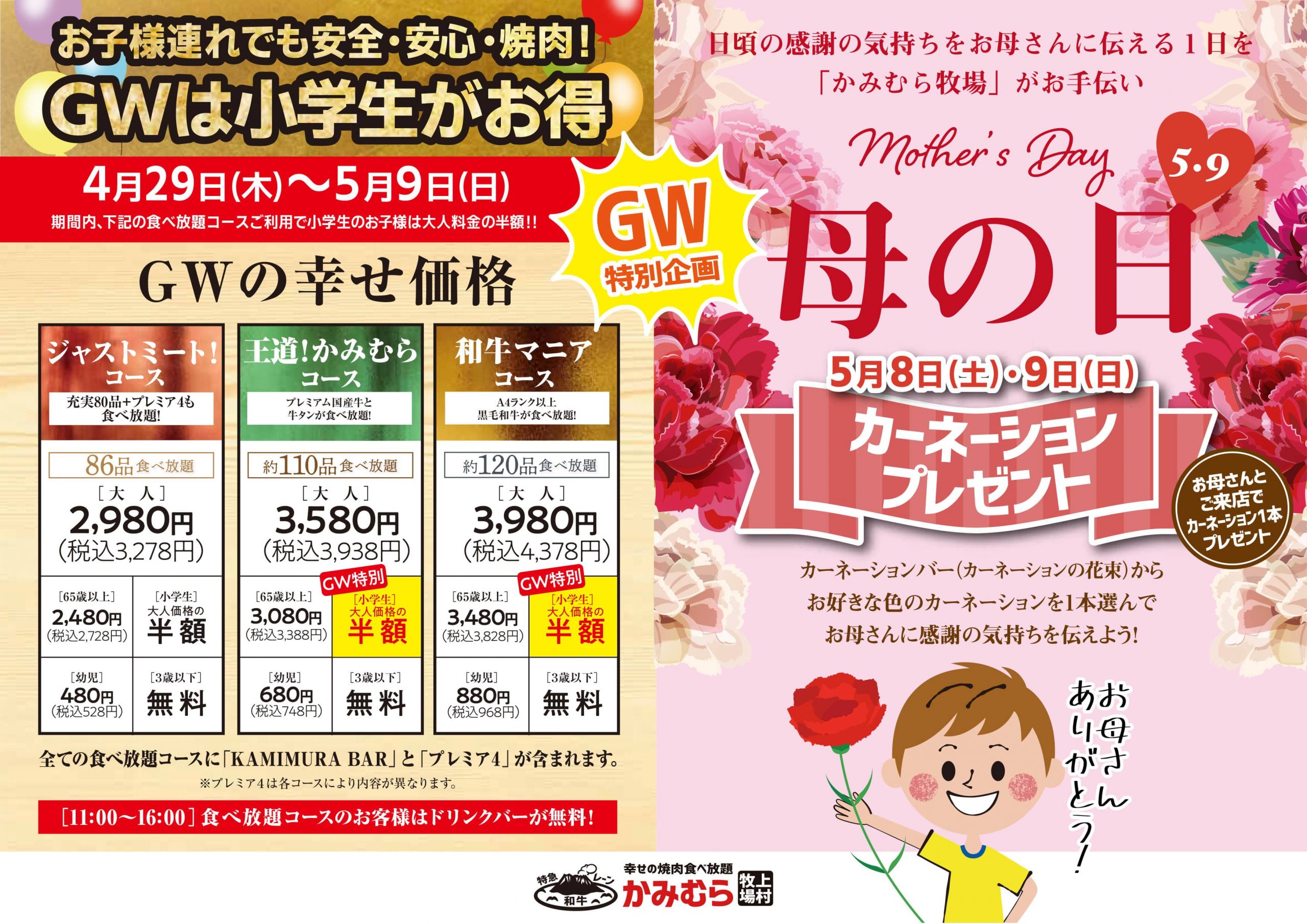 ゴールデンウィーク期間中、食べ放題コースの「和牛マニアコース」と「王道︕かみむらコース」が小学生限定で大人料金の半額になるキャンペーンです。